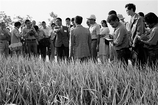 1986年10月6日,湖南杂交水稻研究中心试验田,袁隆平向出席杂交水稻国际学术讨论会的外国专家学者介绍水稻情况。陈金华 摄 |