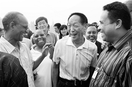 2009年9月12日,袁隆平和参加杂交水稻技术对外合作部长级论坛的代表交流。 湖南日报·新湖南客户端首席记者 郭立亮 摄 |