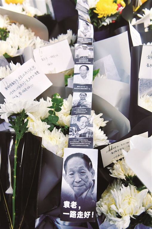 5月24日,长沙市明阳山殡仪馆,前来送别的群众打印出袁隆平院士的图片,缅怀追思。