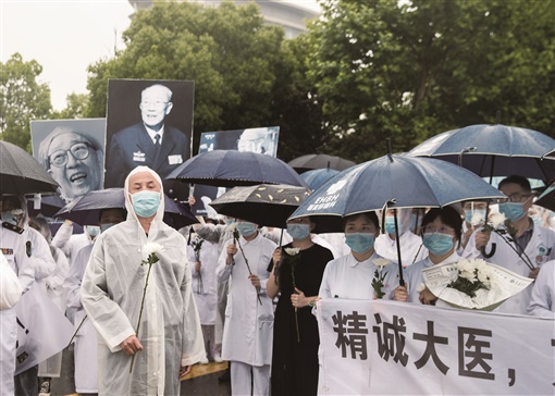 5月26日,载着吴孟超同志骨灰的灵车来到海军军医大学第三附属医院安亭院区,并绕行一周。医护人员目送灵车缓缓驶过。新华社发