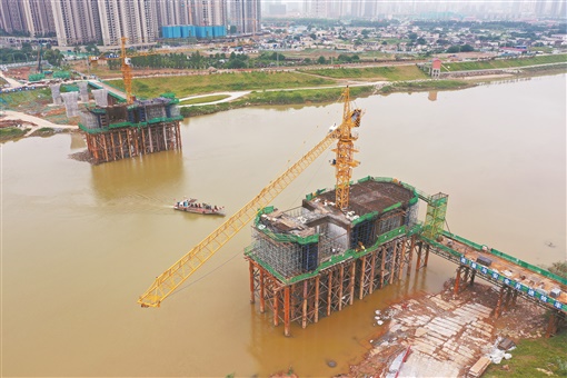 5月31日,长沙花侯北路浏阳河桥项目工地,工人正在进行现浇箱梁施工。该桥南起合丰路,北至望龙路,全长1745米,双向六车道,设计时速50公里,为城市主干道。该桥投入使用后,将优化长沙城东交通环境,方便市民出行。 湖南日报·新湖南客户端记者 田超 摄