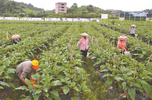 6月1日,新田县中山社区潭田村蔬菜基地,村民给茄子施肥。近年,该县大力发展生态绿色蔬菜产业,以“龙头企业+合作社+基地+农户”的模式,打造粤港澳大湾区蔬菜专供基地,丰富粤港澳市民的“菜篮子”。 刘贵雄 摄