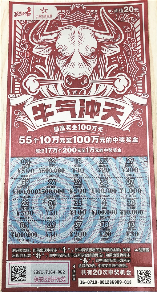 5月30日,长沙一位购彩者又刮中“牛气冲天”10万元大奖。第二天一大早,就来到长沙市芙蓉区车站北路香泽南湖大厦一楼体彩服务大厅兑领了自己的幸运奖金。经与工作人员交谈后得知,中奖者是一位“95后”,平时喜欢玩体彩顶呱刮,30日下午,他先购买了一张“点石成金”和一张“牛气冲天”,在刮“点石成金”中得20元后,他用奖金又购买了一张“牛气冲天”,刮中了10万元大奖。