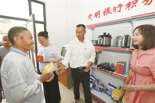 6月16日,资兴市州门司镇丹坳村“文明银行”,村民在凭借积分兑换日常生活用品。今年,州门司镇在丹坳村、塘家湾村试点开展“文明银行”活动,通过“加减积分”量化文明风尚、“月评积分”建立道德台账、“积分换物”深化道德激励,搭建村民自治新平台,引导村民积极参与乡村治理,助力乡村振兴。 李科 曹裴媛 摄影报道
