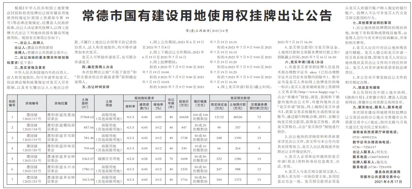 常德市国有建设用地使用权挂牌出让公告