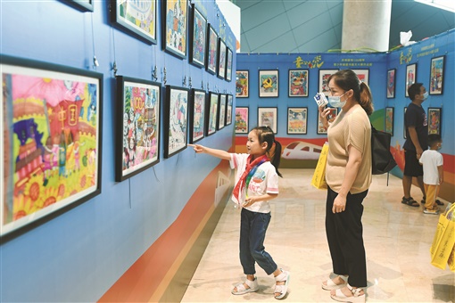 6月20日,观众欣赏青少年获奖绘画作品。当天,“童心向党——庆祝建党100周年”青少年创意书画文大赛颁奖典礼在长沙图书馆举行,现场展出青少年书画文作品百余件,体现了青少年将爱党、爱国、爱社会主义的情感融汇在色彩和文字中,抒发他们作为共产主义事业接班人的理想与信念。
