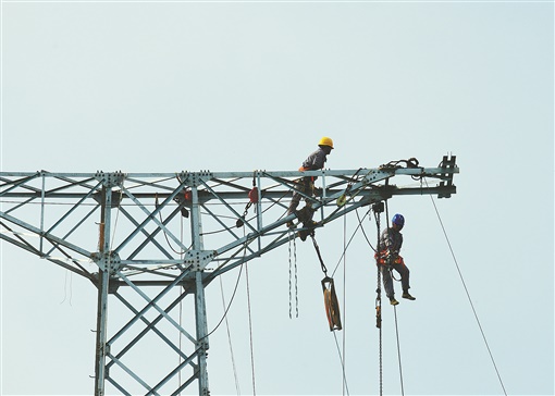 6月20日,嘉禾县晋屏镇甫口村,电力工人在永州塔峰—郴州马托220千伏线路项目工地上紧张施工。连日来,国网湖南省送变电工程有限公司电力工人冒酷暑、战高温、加班加点施工,全力推进工程建设。该工程于2019年12月开工,目前进入扫尾阶段,预计今年8月可完工。工程投产后,可每天供电负荷10万千瓦左右,有效缓解当地电力紧缺局面,促进经济建设发展。黄春涛 摄