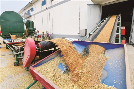 中央农办主任、农业农村部部长唐仁健6月23日在河北三河市调研“三夏”生产时说,今年我国夏粮再获丰收,为全年粮食产量保持在1.3万亿斤以上打下坚实基础。图为当日,在山东省青州市一处粮食收购点,传送机将小麦输送入库。新华社发