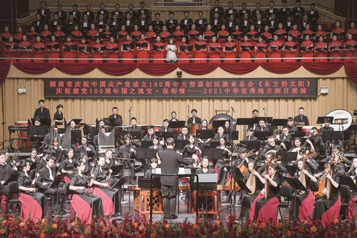 6月24日晚,湖南省庆祝中国共产党成立100周年优秀舞台艺术作品展演剧目,大型原创民族音乐会《东方的太阳》在长沙音乐厅上演。