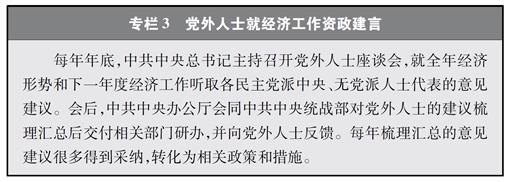 围绕国家方针政策的制定和重大战略的实施献计出力。就国家政治、经济、社会生活中的全局性、战略性、前瞻性重大问题开展考察调研,提出意见建议,是各民主党派、无党派人士发挥作用的重要渠道。多年来,各民主党派中央、无党派人士围绕“一带一路”建设、京津冀协同发展、长江经济带发展、粤港澳大湾区建设、长三角一体化发展、创新驱动引领高质量发展、推进供给侧结构性改革等关系国计民生的重大问题深入考察调研,向中共中央、国务院提出的许多意见建议被采纳。中国共产党积极完善知情明政机制、考察调研机制、工作联系机制、协商反馈机制,为各民主党派、无党派人士知情出力创造条件。