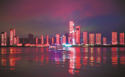6月30日晚,长沙湘江两岸的地标建筑披上红装,流光溢彩,上演绚烂的“七一”主题灯光秀。湖南日报·新湖南客户端记者 傅聪 陈萌 摄影报道