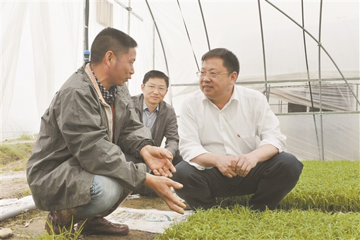 2013年5月,蒙汉(右一)在溆浦县桥江镇新坪村了解水稻集中育秧情况。