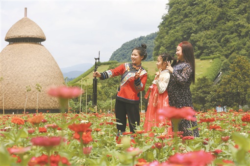 7月4日,游客在张家界市武陵源区黄龙洞景区生态田园广场的花海中赏花游玩。入夏以来,该景区成片的百日菊争相盛开,吸引众多游客前来赏花游玩。吴勇兵 摄