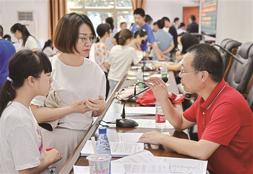 7月5日,长沙财经学校,咨询报名的初中毕业生和家长络绎不绝。学校接受现场咨询3天以来,已有近万人前来咨询登记。与往年相比,今年中职教育成了越来越多人的选择。湖南日报·新湖南客户端记者 童迪 摄