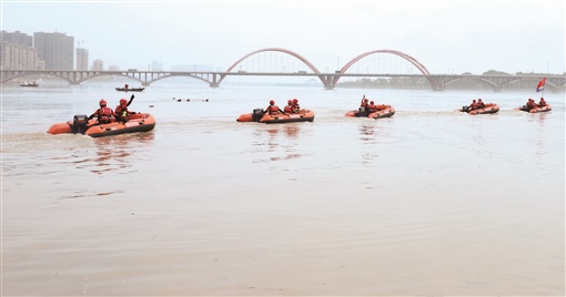 7月5日上午,常德市消防救援支队前置沅水抗洪力量进行舟艇集结训练。连日来,针对当地出现的雨情,前置抗洪力量在集结地开展贴近实战的水域救援大练兵,随时准备处置可能出现的各类险情。陈自德 摄