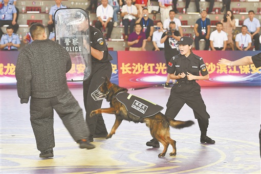 7月13日,保安员进行巡逻犬安防技术演练。当天,首届湖南省保安员职业技能竞赛决赛在湖南警察学院举行。