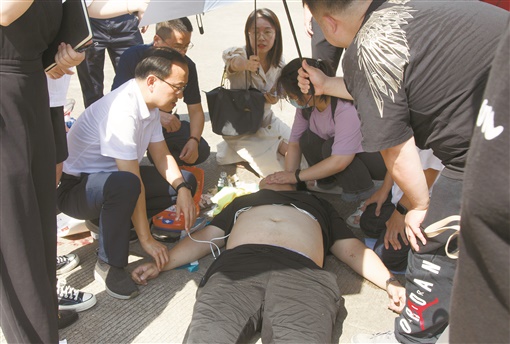 救治过程异常紧张,爱心逐渐在现场汇集。学院师生有人主动替换姜燕给患者做心肺复苏,有人拿来日常配备用于应急的AED设备,有人负责观察患者面色,有人负责清理口鼻异物,将患者的舌头拉出来以维持呼吸道畅通……湘雅医学院党委书记常实、常务副院长柴湘平、副院长段绍斌等人听闻情况,也赶紧放下手中事务,以最快速度跑到现场,组织指导完成急救工作及后续转运抢救工作。