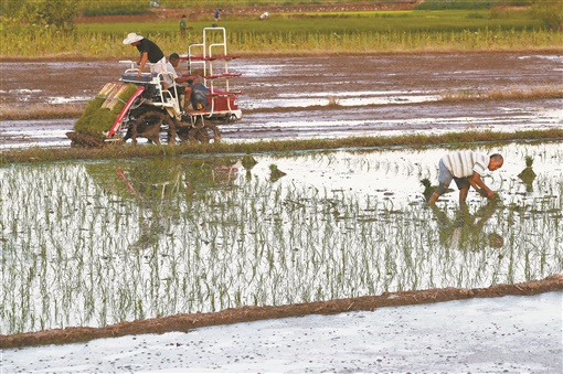 7月13日,新田县三井镇谈文溪村,村民在插秧。连日来,当地村民克服高温天气影响,抢插晚稻秧苗。 刘贵雄 摄