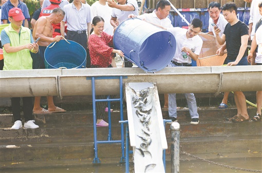 7月14日,市民和志愿者参加增殖放流活动。当天,浏阳市农业农村局在浏阳河官渡河段开展鱼类人工增殖放流活动,共放流鱼苗60余万尾,改善水域生态环境。