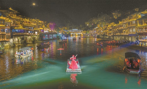 “湘见·沱江”,相遇凤凰,流光溢彩、惊艳世人。夜幕降临,凤凰古城亮起万盏灯火。随着游船缓缓启动,一场盛大的声光影盛宴,在游客面前徐徐揭开帷幕。
