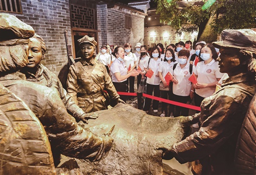 7月18日,汝城县文明瑶族乡沙洲村红色文化陈列馆,讲解员为参观者讲述“半条被子”的故事。当天,临武县创新创业协会成员来到沙洲村,开展“寻红色印记 扬巾帼力量”主题教育活动,感悟中国共产党同人民风雨同舟、生死与共、血脉相通的深情。