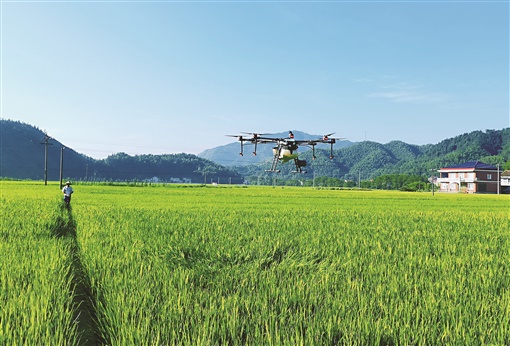7月18日,安化县羊角塘镇王家坪村,农民操控无人机喷洒有机农药。近期,当地农民抢抓农时,对稻田及时喷洒农药防病虫害,为丰收打好基础。