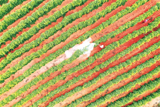 7月16日,宁远县太平镇宁佳洞千亩淮山基地,农民在施药管理。近年,该镇依托土地整治项目,开发荒山1.2万余亩,引导农民种植淮山、葛根等耐旱作物,将昔日荒山变为对接粤港澳大湾区品牌蔬菜基地,带动农民增收,助力乡村振兴。