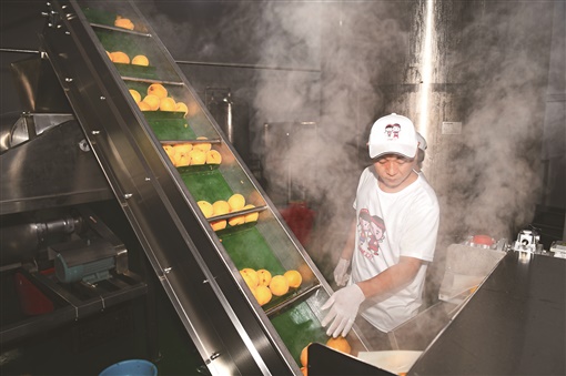 7月19日,炎陵县娜妹子农业开发有限公司生产车间,工人在监控黄桃自动化生产线运行。当天,炎陵县首条炎陵黄桃深加工生产线启用,每小时可将5吨鲜果压榨成原浆果汁。