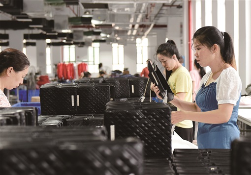 7月19日,蓝山县皮具箱包科技产业园嘉益皮具有限公司,员工在赶制产品。近年,该县积极对接粤港澳大湾区,出台系列措施优化营商环境,加快皮具箱包产业发展。目前,全县已引进皮具箱包企业80余家,产品出口欧美等地。杨雄春 摄