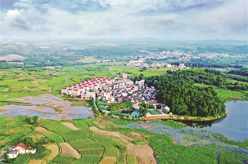 7月18日,嘉禾县普满乡江里水库一带,农田、湖水、村庄、林地相互辉映,呈现一幅诗画田园景观。近年来,该县通过推进人居环境整治,推动乡村产业发展,实现农业增效、农村增绿、农民增收。黄春涛 摄