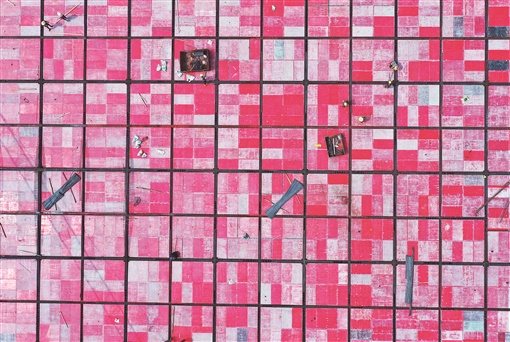 7月17日上午10时,道县电子信息产业孵化基地,工人在厂房顶层施工。近日,该县持续晴热高温,各工地实行错时作业,避开中午高温时段,同时设置茶水间,配备藿香正气水、凉茶等防暑降温物品,应战高温天气,保障工程进度。何红福 摄