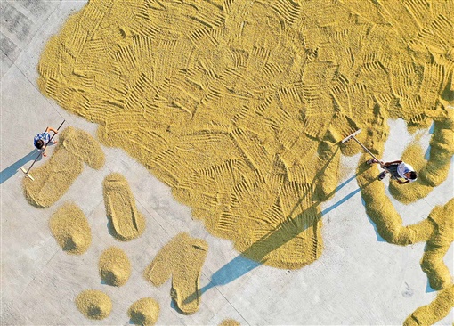 7月23日,道县白马渡镇樟武坊村,农民在晾晒稻谷。今年,道县积极落实发展粮食“双稳”目标,出台早稻集中育秧、治理耕地抛荒、粮食补贴等政策,提高农民种粮积极性,促进了粮食增产丰收。 蒋克青 文云 摄影报道