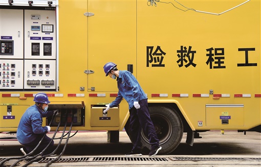 近日,河南郑州出现持续强降水天气,造成市区严重内涝,大面积电力受损。目前,郑州供电部门实施“一对一”对接,对受损电力设施开展抢修,保障生产生活电力供应。图为7月23日,来自国家电网山东菏泽供电公司的电力应急抢修增援人员在郑州市纬一路瑞园小区抢修电力设施。新华社发