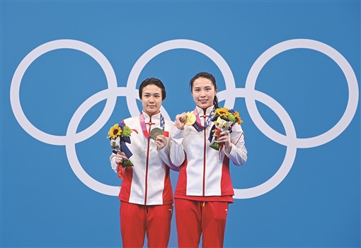 7月25日,在东京奥运会跳水女子双人三米跳板决赛中,中国选手施廷懋/王涵夺得冠军。新华社发