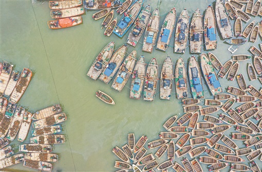 7月26日,受今年第6号台风“烟花”影响,山东荣成海域的渔船纷纷停止作业,靠港避风。图为渔船停靠在山东荣成桑沟湾北海岸一处港湾码头躲避台风(无人机照片)。新华社发
