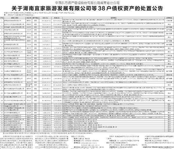 中国东方资产管理股份有限公司湖南省分公司 关于湖南宜家旅游发展有限公司等38户债权资产的处置公告