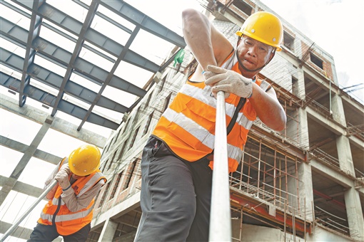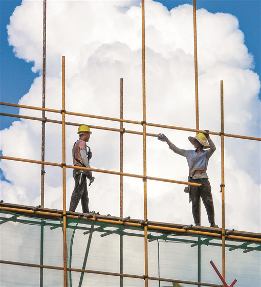 上图:7月27日,通道侗族自治县双江镇建筑工地,工人顶着烈日在搭建脚手架。尹序平 尹圣涵 摄影报道