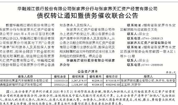 华融湘江银行股份有限公司张家界分行与张家界天汇资产经营有限公司 债权转让通知暨债务催收联合公告