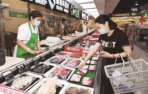 8月2日,华润万家长沙世纪金源店,市民在购买鲜肉。近段时间,长沙各大商场超市商品供应充足,同时积极做好疫情防控工作,为市民提供一个安全、放心的购物环境。湖南日报·新湖南客户端记者 田超 摄 |