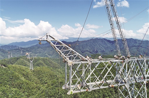 站在海拔510米的人溪村放眼望去,翠绿的山巅耸立起一座座铁塔,甚是壮观。“电网蜘蛛侠”攀附在铁塔高空,显得更加渺小,却定格了最美身影。