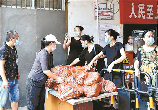 图① 8月9日,油库垭小区居民在排队领取志愿者送来的蔬菜。慈利县张家界上品装饰有限公司、永兴建材2家企业自购近4吨生活物资,免费送给县城各小区居民。黄岳云 摄