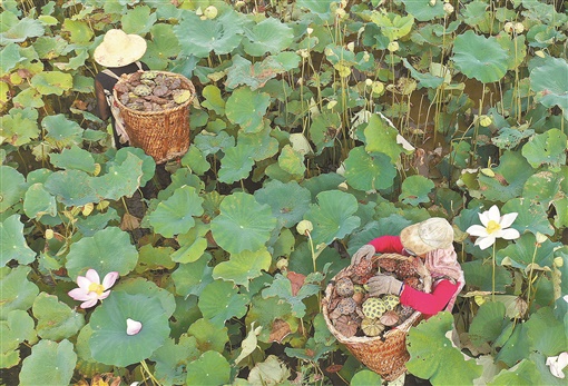8月9日,道县梅花镇贵头村荷田,村民在采摘莲蓬。 时下,该村的“太空莲”陆续成熟,农民忙着采摘上市。何红福 李昊璋 摄影报道