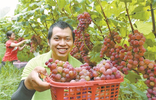 8月10日,城步苗族自治县蒋坊乡铺头村农民在采摘葡萄。近年,该县立足独特的高寒山区气候优势,大力普及“大棚+有机肥+套袋”等新技术,种植的葡萄走俏市场。目前,全县已发展葡萄种植面积6000余亩,成为农民增收的重要途径。