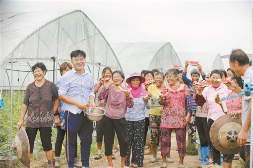 8月10日,衡阳县渣江镇三马新村,农民在田间休息吃西瓜解渴。今年,该村发展西瓜、甜瓜等特色产业,通过“公司+村集体+合作社+农户”的发展模式,为当地乡村振兴注入了新动能。刘欣荣 摄
