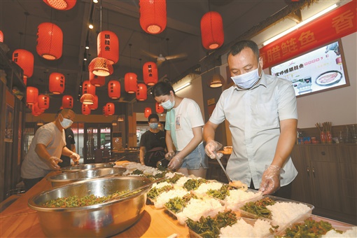 8月10日,长沙市芙蓉区新合村经济合作社工作人员,在辖区火星街道一饭店内准备爱心餐。目前,该合作社已累计赠送了近千份爱心餐。