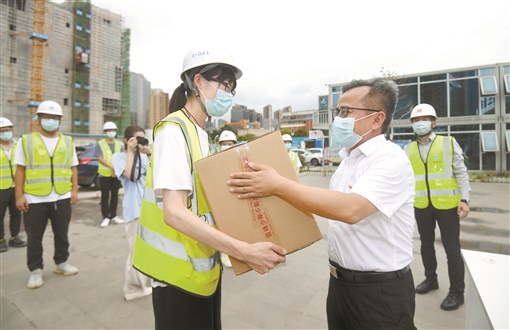 8月13日,共青团长沙市雨花区委员会组织来到中建五局三公司星城天地项目部,慰问建设一线的青年工人,给他们送去防疫慰问物资。