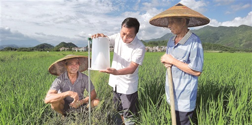 8月17日,宁远县湾井镇田心村,农民技术员李建勋(中)给村民讲解性诱捕器的使用及维护。近年,该村采用“菜-稻”“烟-稻”水旱轮作、安装太阳能杀虫灯、性诱捕器等生物方法防控病虫害,打造千亩生态优质稻基地,提升粮食品质,促进农民增收。
