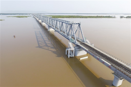 中俄两国首座跨江铁路大桥——同江中俄黑龙江铁路大桥8月17日实现铺轨贯通,该桥位于中国黑龙江省同江市与俄罗斯下列宁斯阔耶市之间,设计运营时速100公里、年过货能力2100万吨。图为17日拍摄的同江中俄黑龙江铁路大桥(无人机照片)。