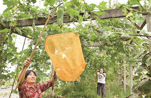 8月18日,洞口县岩山镇月塘村,村民在采摘丝瓜。近年,岩山镇引导农民发展蔬菜种植,并推行产供销一体的订单生产,种植的丝瓜、圣女果、西红柿等蔬菜源源不断销往县内外市场,促进了农民增收。滕治中 摄