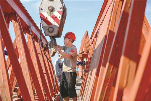 8月21日,道县国道207绕城公路潇水二桥拓宽桥梁项目工地,工人在安装龙门吊,力争桥梁早日全面通车。